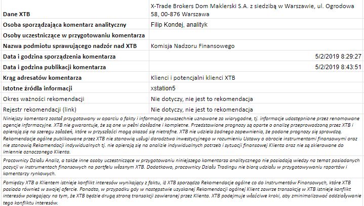 Warto również wspomnieć o dobrej kondycji funta, który zyskuje na pozytywnych doniesieniach dotyczących Brexitu. W środę wieczorem część brytyjskich mediów poinformowała, że premier Theresa May i przewodniczący Partii Pracy, Jeremy Corbyn, są coraz bliżej sfinalizowania umowy ws. Brexitu. Przypomnijmy, że drużyny negocjatorów pod przewodnictwem kluczowych postaci z dwóch stron brytyjskiej sceny politycznej od miesiąca próbują wypracować tekst porozumienia, który zostanie zaakceptowany przez parlament. Mówi się, że Theresa May jest skłonna zgodzić się na pozostanie w europejskiej unii celnej, jeśli jest to ceną zdobycia poparcia parlamentu. Byłoby to korzystne dla gospodarki brytyjskie, ponieważ złagodziłoby negatywny wpływ wyjścia Wielkiej Brytanii z Unii na relacje handlowe. Niemniej jednak, trzeba pamiętać, że Theresa May obiecała wcześniej, że na takie rozwiązanie się nie zgodzi, tak więc taki ruch mógłby rozzłościć członków Partii Konserwatywnej i na nowo rozbudzić dyskusję o zmianie premiera. Pogłoski na rynku sugerują, że “znaczące” posiedzenie brytyjskiego rządu ws. Brexitu może odbyć się w dniach 7-8 maja, więc może przyjść nam poczekać na więcej szczegółów do przyszłego tygodnia.