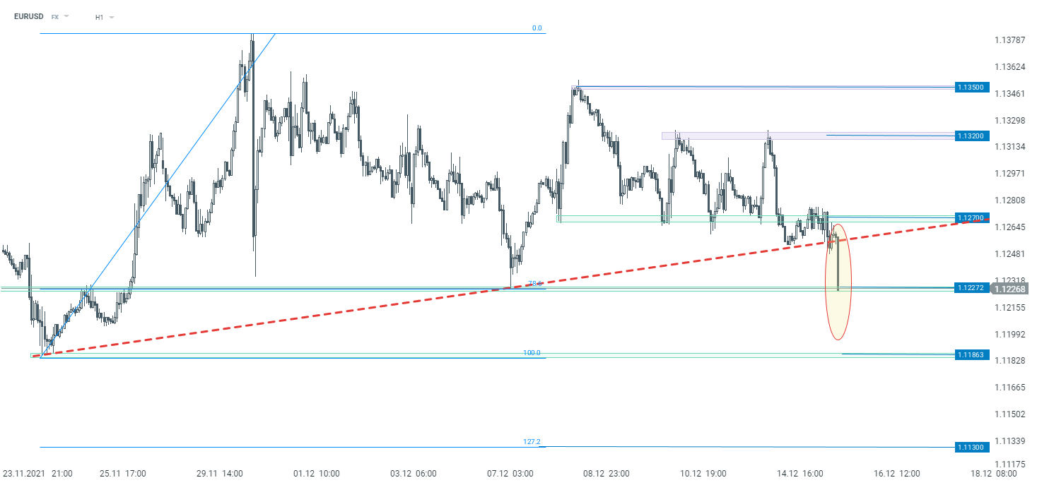 EURUSD ruszyłw dół po publikacji decyzji. Patrząc na interwał H1, notowania wybiły w dół linie poprowadzoną po ostatnich dołkach, co świadczy o kontynuacji trendu spadkowego. W przypadku utrzymania się tego sentymentu i ustanowienia nowych dołków, niewykluczony jest atak na wsparcie przy 1,1130, gdzie znajduje się mierzenie 127,2% Fibonacciego, wyznaczone na ostatniej dużej korekcie wzrostowej. Na razie jednak notowania testują wsparcie przy 1,1227.