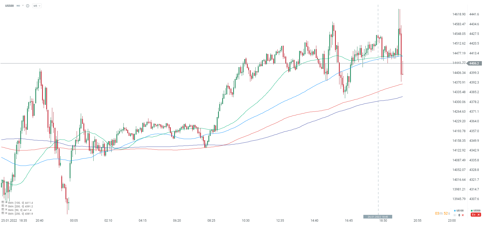S&P 500 wzrósł do dziennych szczytów, ale dosyć szybko stracił ok. 40 punktów. Źródło: xStation5
