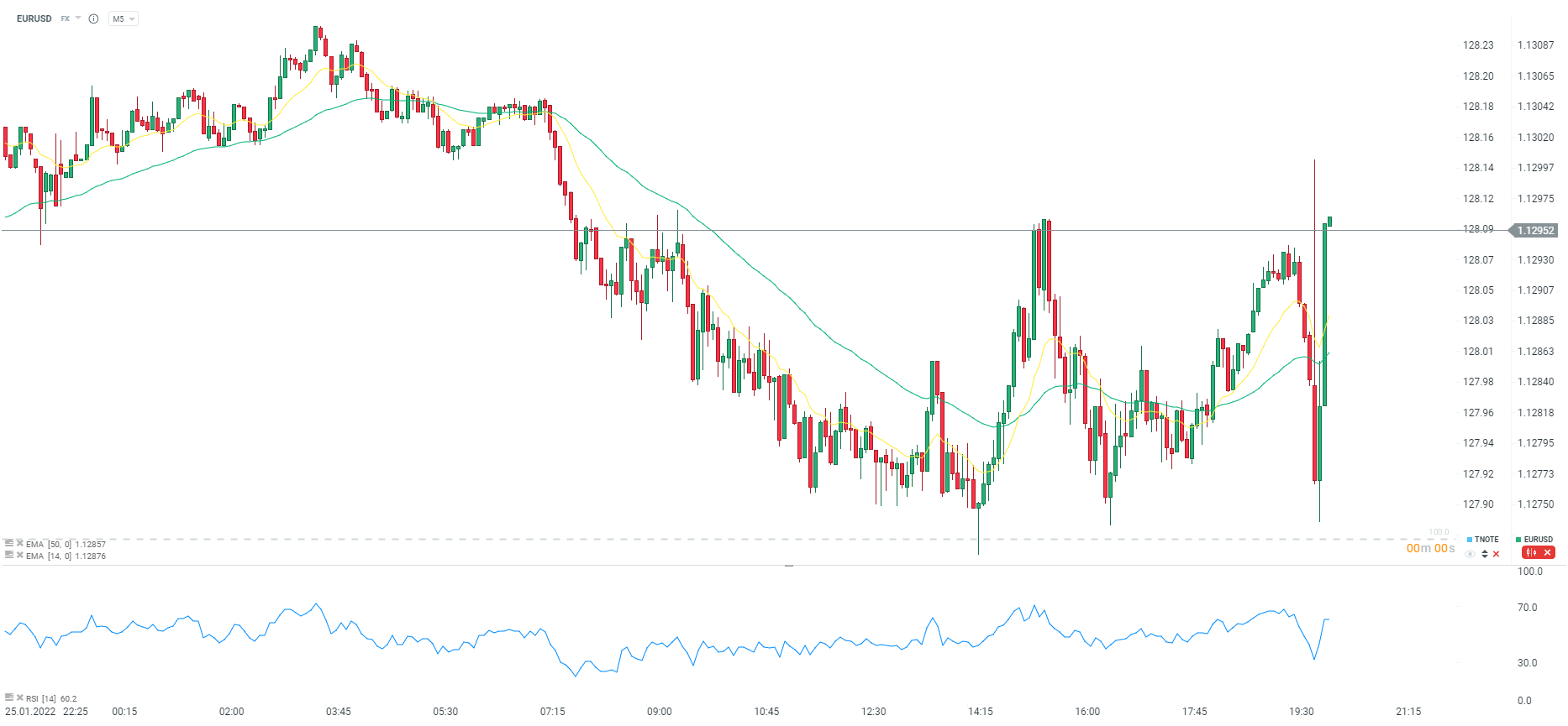 EURUSD z okolic dziennych dołków powraca w okolice szczytów z początku i środka sesji europejskiej. Zmiennośc nie jest jednak zbyt duża. Źródło: xStation5