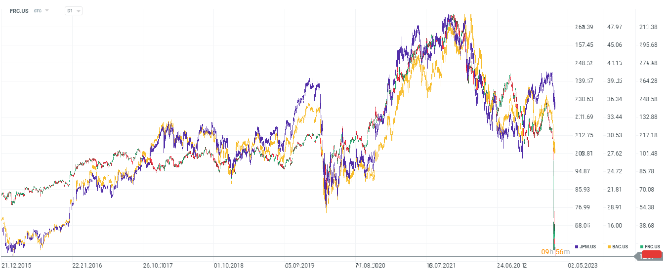 Akcje First Republic Bank, US Bancorp (BAC.US, żółty) oraz JP Morgan (JPM.US, fioletowy). Źródło: xStation5