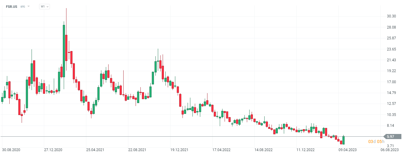 Akcje Fisker (FIS.US) gwałtownie odbiły na dzisiejszej sesji i kontynuują rozpoczęte wczoraj wzrosty. Patrząc na szerszym interwale duża świeca zakupowa może zwiastować formację 'objęcia hossy'. Źródło: xStation5