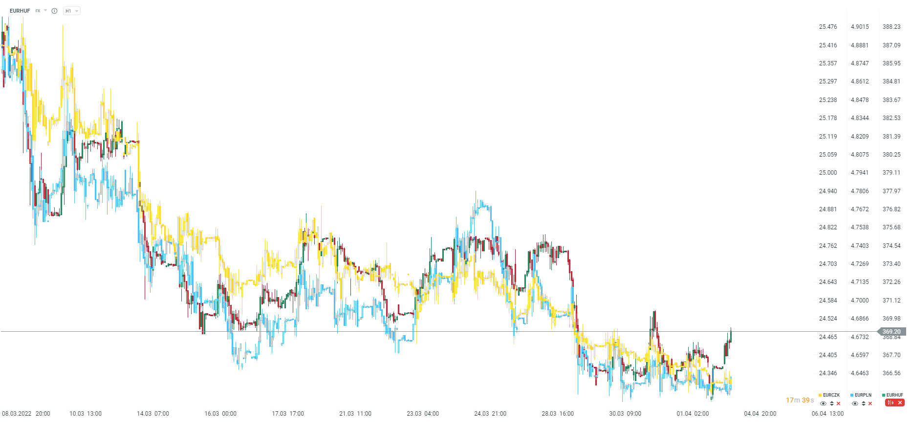 Po pozytywnym otwarciu dla forinta, aktualny wzrost na parze wynosi ponad 0,5% przy stabilnym złotym oraz czeskiej koronie wobec euro. Źródło: xStation5