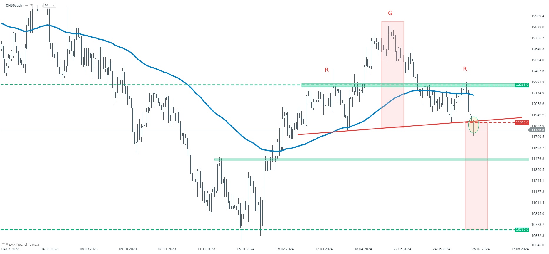 Notowania CHN50cash od pewnego czasu poruszają się w konsolidacji. Patrząc na interwał D1, konsolidacja przybrała kształt formacji głowy i ramion (RGR), która zgodnie z klasycznymi założeniami analizy technicznej może zwiastować zmianę trendu na spadkowy. Podczas wczorajszej sesji doszło do naruszenia linii szyi wspomnianej formacji RGR, a dziś została ona wybita w dół. Modelowy zasięg dla tego typu układu to nawet poziom 10730 pkt, gdzie wypadają także minima ze stycznia 2024 roku. Wcześniej należy również zwrócić uwagę na wsparcie przy 11450 pkt, które wynika z poprzednich reakcji cenowych. Oporem w krótkim terminie pozostaje poziom 11865. Dopiero powrót powyżej niego mógłby dać nadzieje rynkowym bykom. Z kolei dopiero pokonanie oporu przy 12265 pkt mogłoby zwiastować powrót do tendencji wzrostowej.