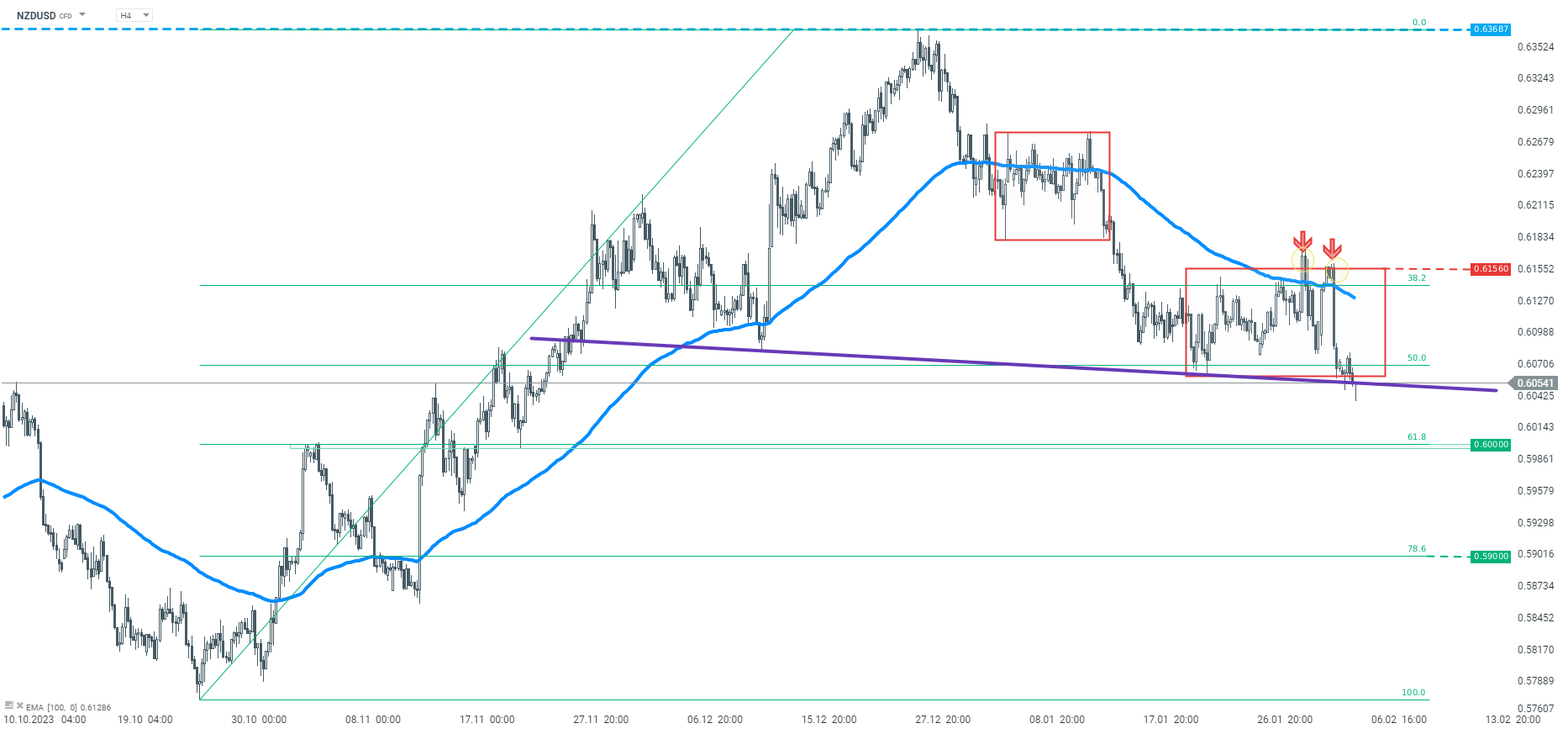 Patrząc technicznie na wykres NZDUSD na interwale H4, utworzyła się formacja głowy i ramion (RGR). Aktualnie kurs testuję linię szyi wspomnianego układu (fioletowa linia na wykresie poniżej), a w przypadku jej przełamania, przecena może przybrać na sile. Zgodnie z założeniami klasycznej AT będzie to pretekst do zmiany trendu na spadkowy. Scenariusz spadkowy jest także wspierany przez metodologię Overbalance. W minionym tygodniu cena odbiła się od górnego ograniczenia układu 1:1 (czerwony prostokąt), co potwierdza niedźwiedzi sentyment. W przypadku powodzenia takiego scenariusza, janko najbliższe wsparcia należy traktować poziomy 0,6000, oraz 0,5900. Pierwszy z nich wynika z mierzenia 61,8% Fibonacciego ostatni fali wzrostowej oraz wcześniejszych reakcji cenowych, a drugi z samego współczynnika Fibo.
