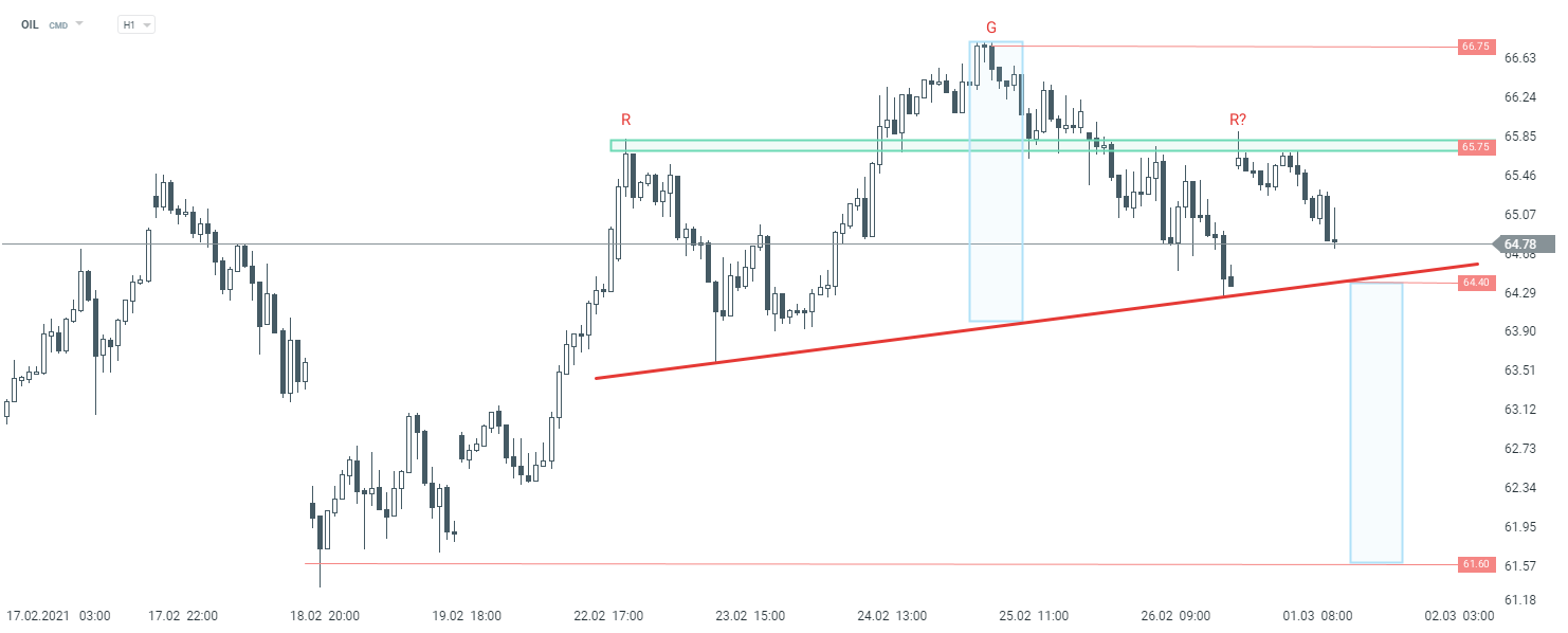 Rynek ropy naftowej od dłuższego czasu porusza się w trendzie wzrostowym. Niemniej patrząc na wykres godzinowy, wzrosty wyhamowały, przez co istnieje ryzyko wystąpienia korekty. Na interwale H1 buduje się formacja pochodząca z klasycznej analizy technicznej - głowa z ramionami (RGR). Pomimo, że notowania otworzyły się dziś luką wzrostową, tak sprzedający przejęli inicjatywę na wysokości potencjalnego lewego ramienia, przez co istnieje szansa na pogłębienie spadków. Scenariusze ten może się zrealizować w momencie wybicia linii szyi układu, która znajduje się w ramach 64,4$. Modelowy zasięg dla takiej formacji zakłada nawet ruch w kierunku ostatnich minimów przy 61,6$. Z drugiej strony, w przypadku wyjścia ceny powyżej poziomu 65,75$, scenariusz spadkowy zostanie zanegowany.