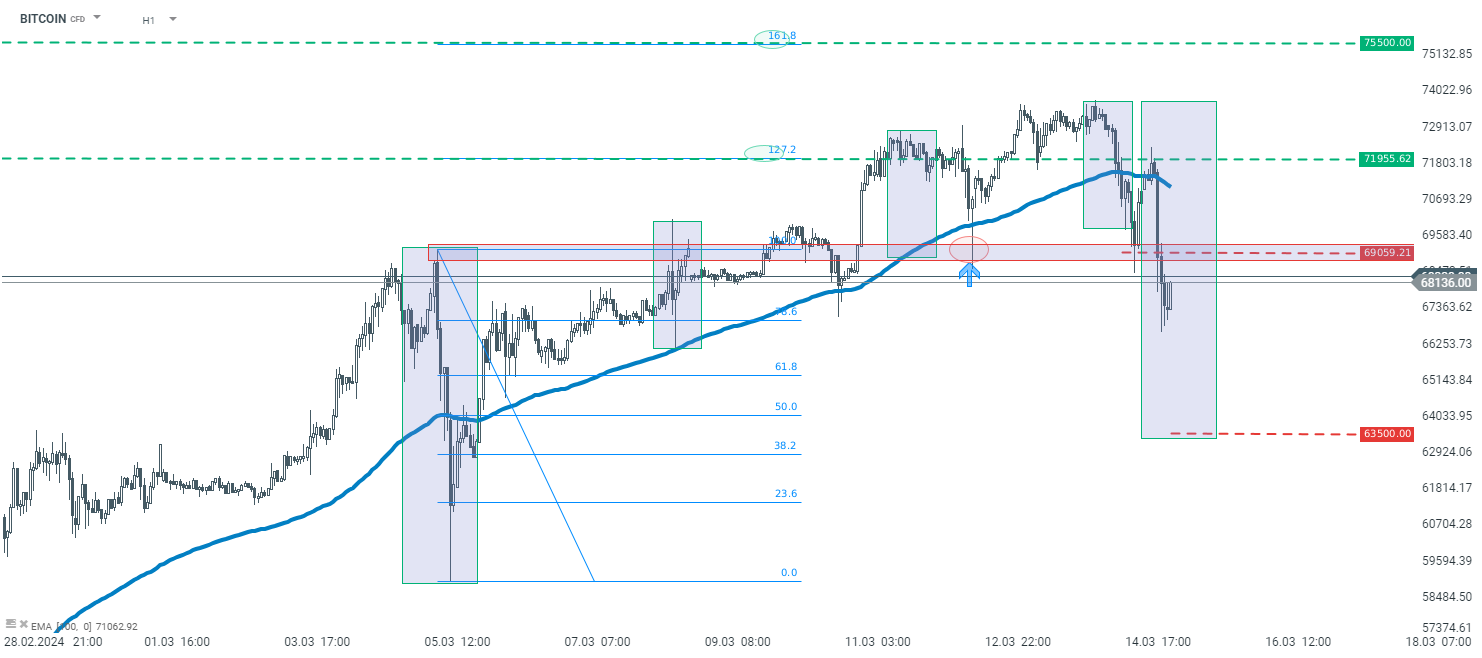 Jeśli chodzi o niższy przedział czasowy, Bitcoin koryguje ostatnie zwyżki. Notowania spadły poniżej krótkoterminowej strefy wsparcia przy 69 tys. USD i jeśli utrzymają się poniżej istnieje możliwość pogłębienia przeceny. Rozważając scenariusz spadkowy, niewykluczone jest zejście do poziomu 62500$, gdzie wypada dolne ograniczenie układu 1:1. Dopiero tej geometrii mogłoby doprowadzić do zmiany trendu na spadkowy. Na razie jednak możemy mówić o korekcie w trendzie wzrostowym.