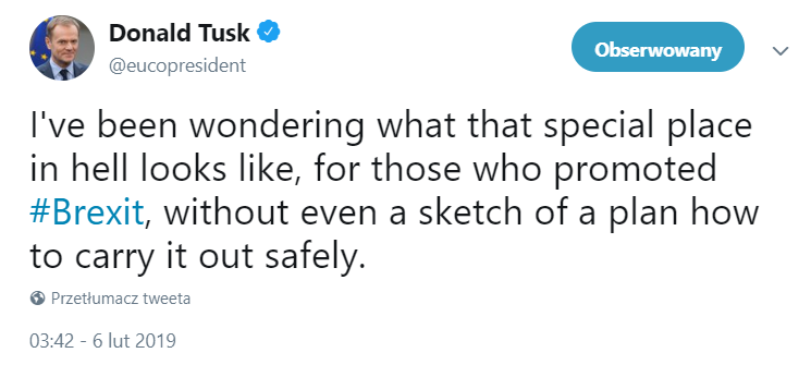 Donald Tusk jasno komentuje obecną sytuację związaną z Brexitem. Źródło: Twitter