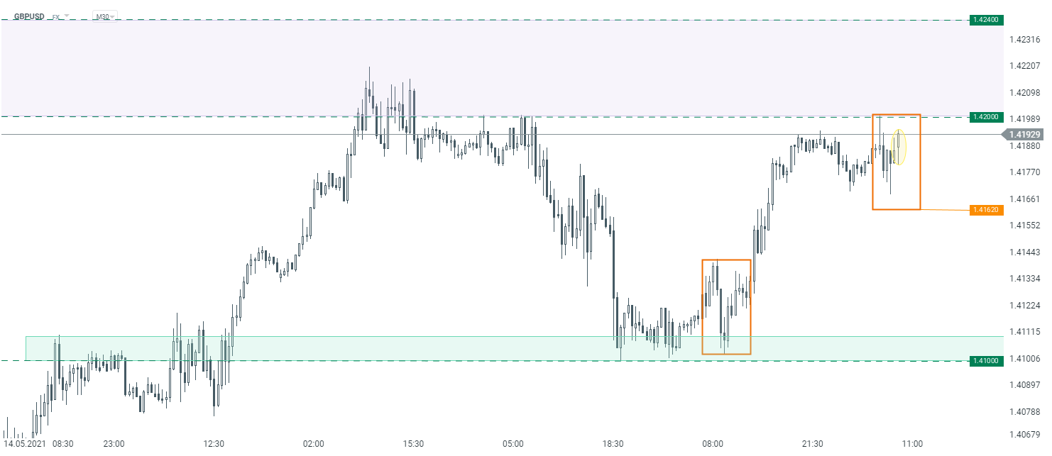 Patrząc technicznie na notowania GBPUSD, notowania utrzymują się dziś w konsolidacji. Jeśli chodzi o opory, cały czas pod uwagę trzeba brać szeroką strefę z interwału D1 -1,4200 - 1,4240. Z kolei jako intradayowe wsparcie należy traktować poziom 1,4162, który wynika z dolnego ograniczenia lokalnego układu 1:1.