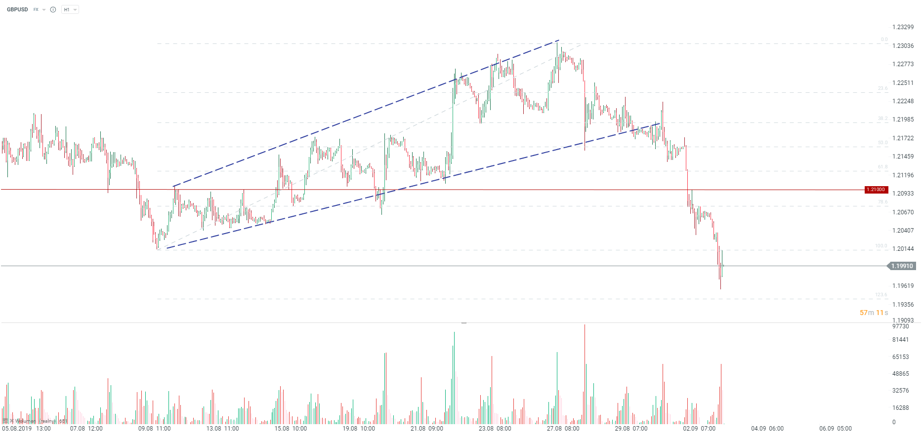 Brytyjski funt znajduje się pod presją od końca sierpnia ze względu na kontrowersyjne zamknięcie prac brytyjskiego parlamentu, które może utrudnić zapobiegnięciu wyjścia z UE bez porozumienia. Dzisiaj poznaliśmy kolejne dane z brytyjskiej gospodarki wskazujące na fatalne nastroje wśród przedsiębiorców z sektora konstrukcyjnego. PMI konstrukcyjny spada do poziomu 45 punktów przy oczekiwaniu odbicia do 46,5 z poziomu 45,3 punktów. W szczegółach raportu można przeczytać, że nowe zamówienia znajdują się na najniższym poziomie od marca 2009 roku.