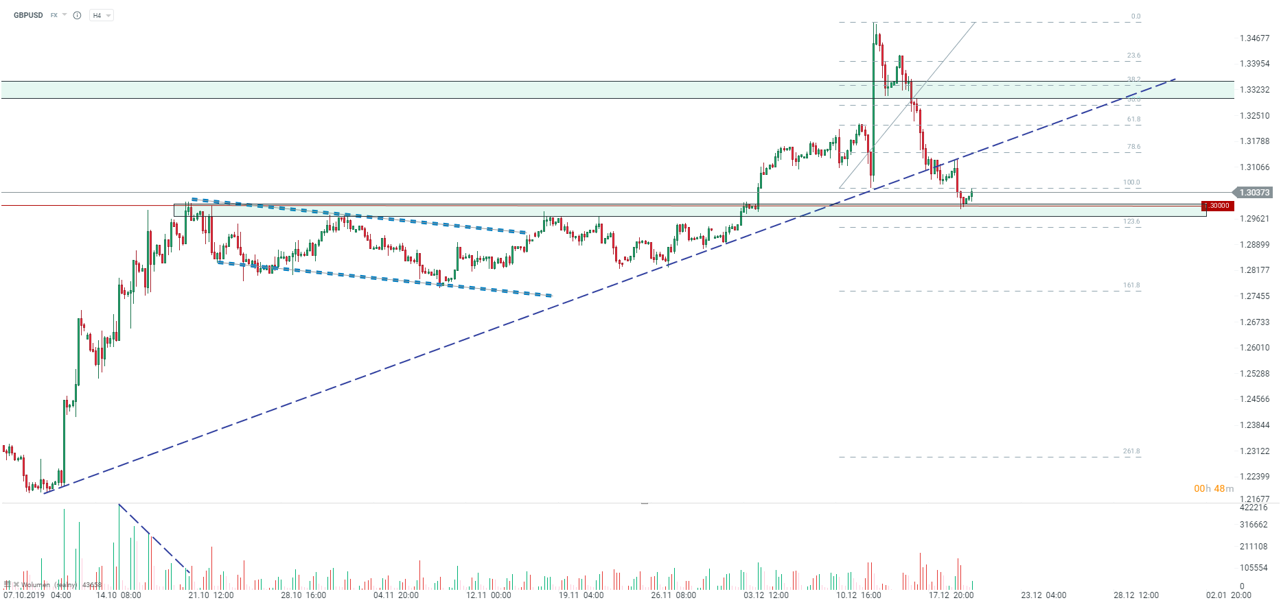 Para GBPUSD cofnęła się mocniej wczorajszego dnia osiągając okolice poziomu 1,3000. Jest to jednak górne ograniczenie bardzo silne strefy popytowej, choć byki mogą się martwić wybiciem wzrostowej linii trendu. Obecnie ruch wzrostowy nie jest na tyle silny, aby przebić się przez lokalny dołek stanowiący początek odbicia związanego z wyborami. Kolejny silny opór to okolice zniesienia 78.6 wraz z linią trendu wzrostowego, natomiast strefa popytowa rozpoczyna się przy zniesieniu 123.6 oraz kończy na poziomie 1,3000. Źródło: xStation5