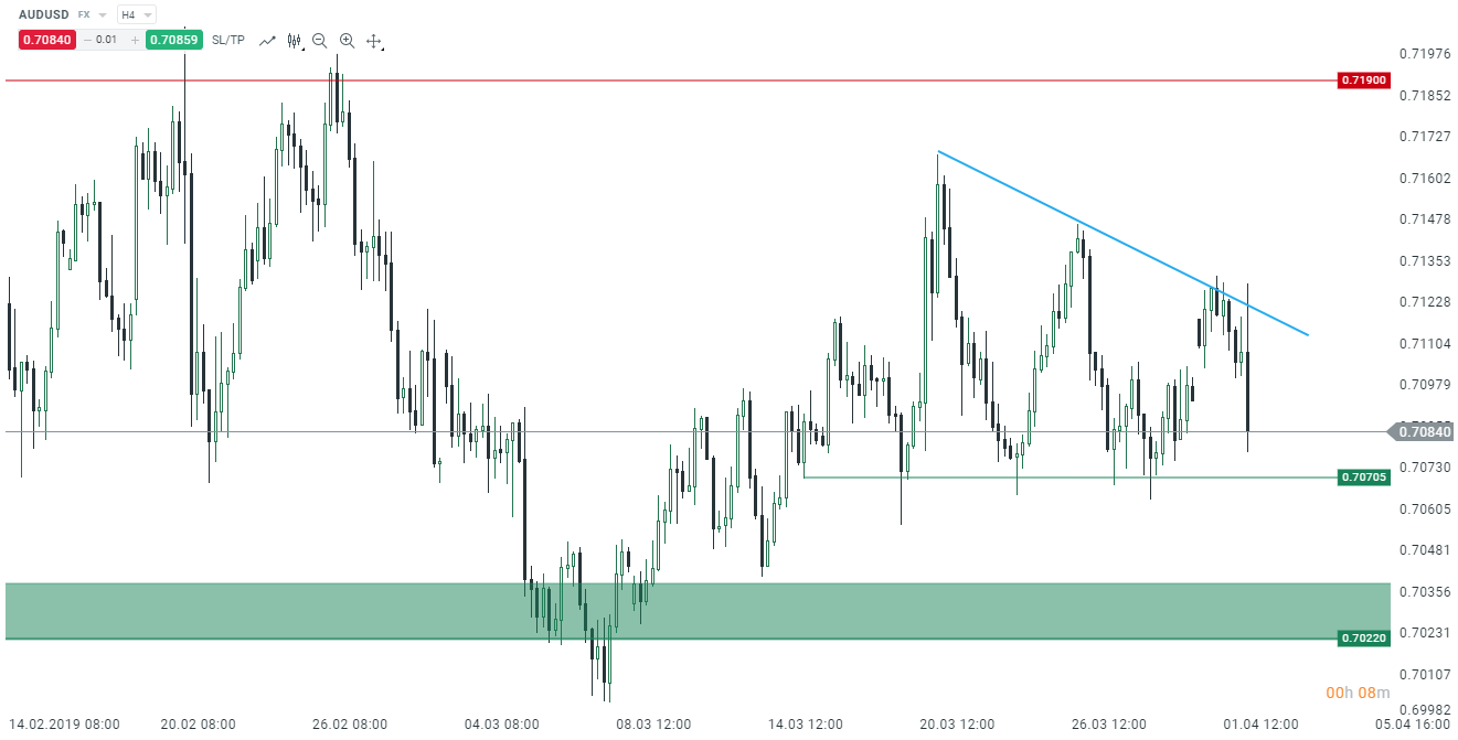 Chociaż Brexit ponownie był w centrum uwagi w ostatnich godzinach, to warto zwrócić uwagę na wydarzenia w Australii. RBA utrzymało stopy bez zmian i w komunikacie zapowiedział monitorowanie rozwoju bieżącej sytuacji i utrzymanie polityki monetarnej wspierającej zrównoważony wzrost oraz osiągnięcie celu inflacyjnego. Sam komunikat nie posiadał znaczących zmian w retoryce w stosunku do marca, jednak dolar australijski stracił po posiedzeniu. Biorąc pod uwagę ostatnią sytuację w Australii, można przypuszczać, że oczy RBA będą skupione na rynku pracy. Nie uważamy jednak, że bank będzie musiał obcinać stopy w tym roku (ostatnie odbicie chińskich PMI może sprzyjać poprawie w 2 połowie roku). Rynek wycenia obecnie jednak aż 80% szans na cięcie stóp przez RBA w tym roku.