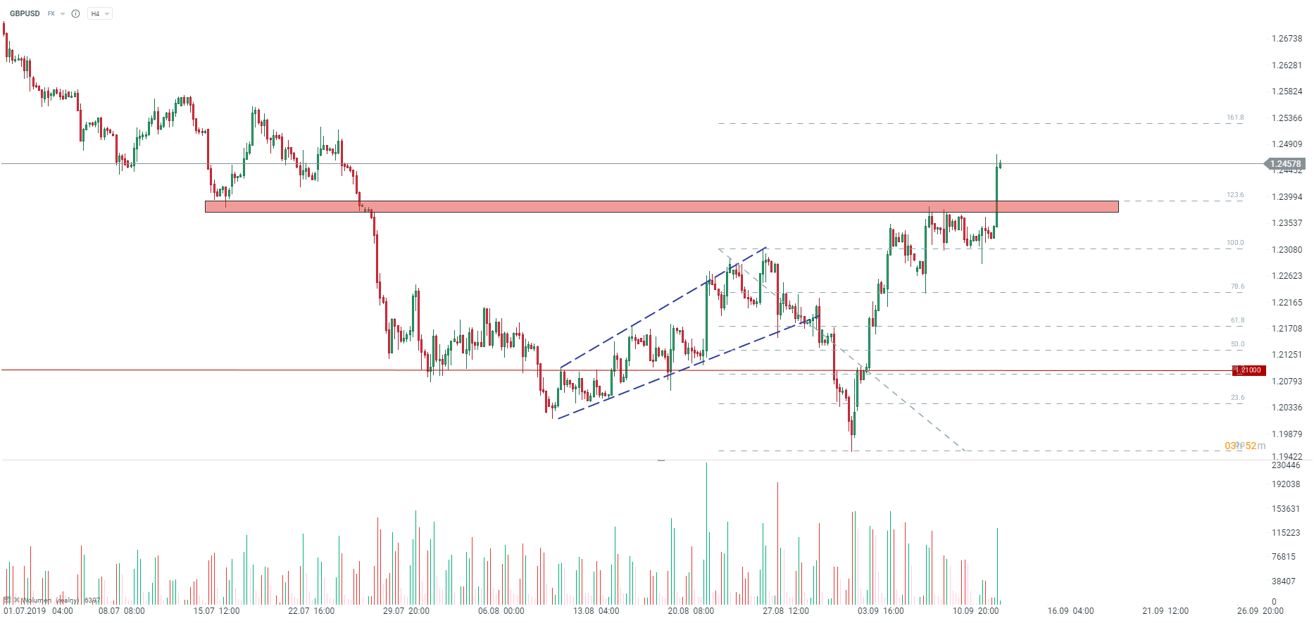 Funt wyraźnie zyskuje w ostatnich minutach, przebijając się przez barierę 1,2400, prawdopodobnie po publikacji informacji o tym, że Johnson ma spotkać się w poniedziałek z szefem Komisji Europejskiej Jean-Claude Junckerem. Według Johnsona zarys potencjalnego porozumienia znajduje się obecnie na stole negocjacyjnym. Kolejny potencjalny cel dla funta to okolice zniesienia 161.8 powyżej poziomu 1,2500.