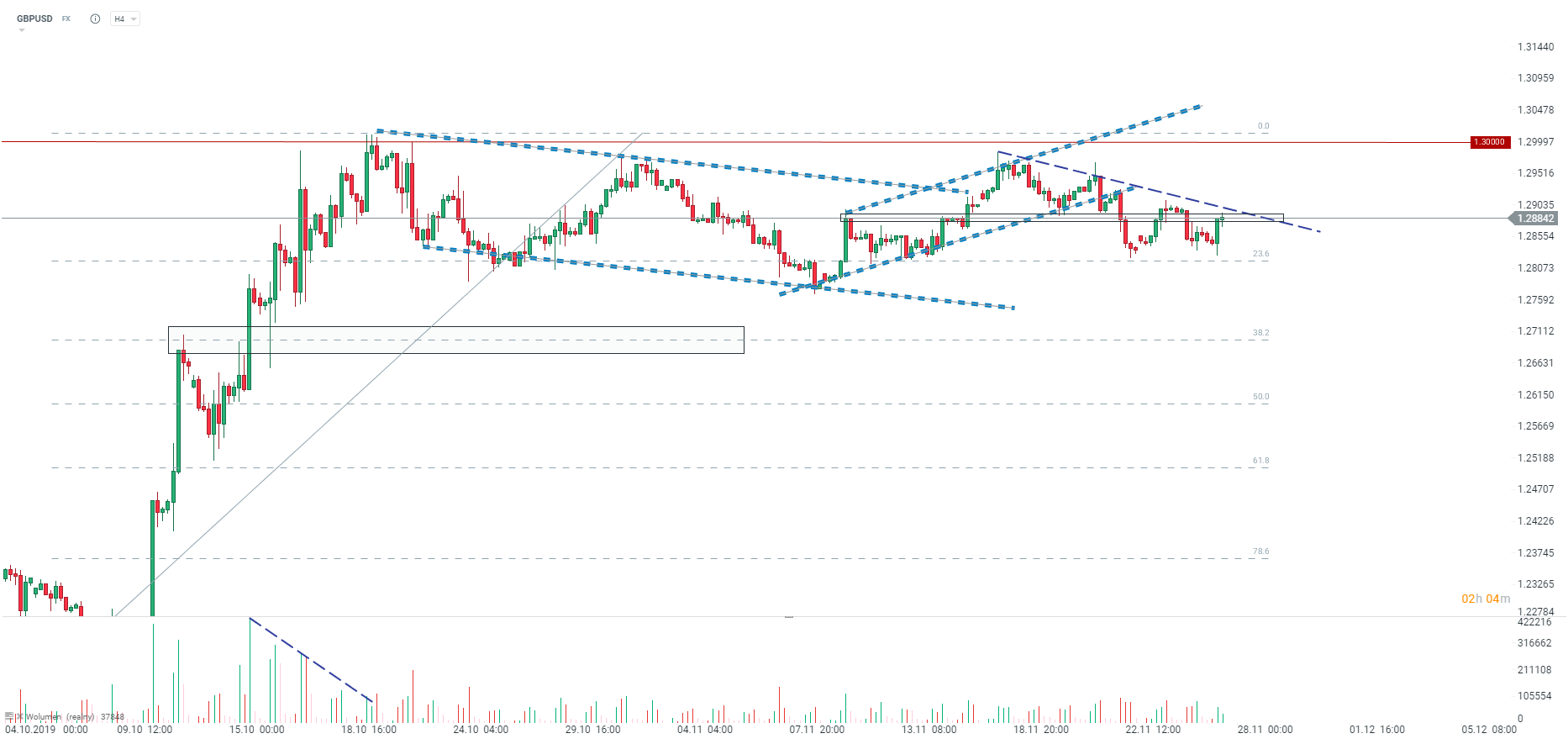 Tymczasem para GBPUSD ponownie cofa się z okolic 1,2900, ale pozostaje na wywyższonych poziomach, poniżej spadkowej linii trendu. Wciąż kluczowym wsparciem dla pary jest zniesienie 23.6. Źródło: xStation5