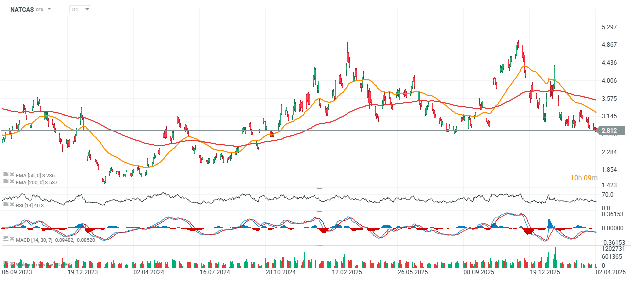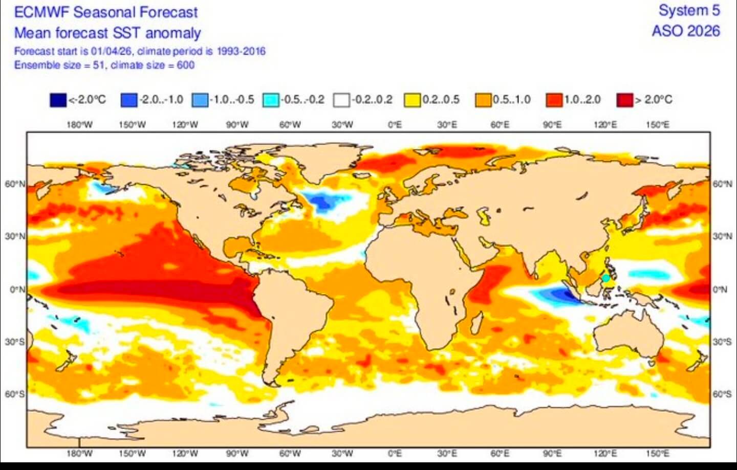 Prognozy wskazują na wyjątkowo silne El Niño w 2026 roku, z możliwym wzrostem temperatur powierzchni oceanów nawet o ok. 2,5°C, co plasuje to zjawisko w skali historycznych epizodów z lat 1997–98 i 2015–16. Taki scenariusz oznacza istotne przesunięcia w globalnych wzorcach pogodowych, w tym łagodniejsze warunki zimowe i mniejszą zmienność letnich temperatur w USA. Z punktu widzenia rynku gazu kluczowe jest to, że prowadzi to do wyższych zapasów oraz ograniczenia popytu na energię w okresie wiosna - lato. W efekcie powstaje środowisko sprzyjające fundamentalnej presji spadkowej na ceny gazu w USA, gdzie popyt i tak pozostaje słaby w obecnej porze roku (niewielkie ogrzewanie i niższy popyt na klimatyzację).