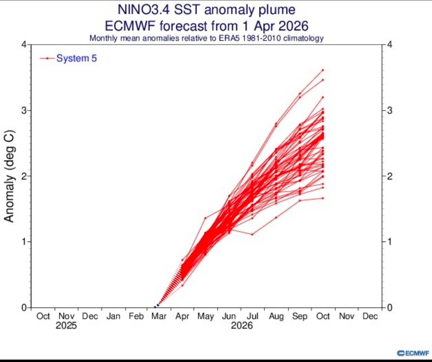 - Modele wskazują niemal jednomyślnie na silne ocieplenie w regionie Niño 3.4 do jesieni 2026, co zwiększa wiarygodność scenariusza bardzo silnego epizodu El Niño.