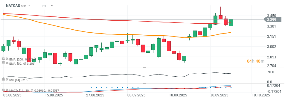 Rynek gazu ziemnego Henry Hub w USA (NATGAS) kontynuuje wzrostowy ruch od wczesnych w poniedziałek, a inwestorzy zaczęli uwzględniać prognozy chłodniejszej pogody w Stanach Zjednoczonych i Europie. Wraz z oczekiwanym wzrostem zapotrzebowania na ogrzewanie, narracja rynkowa powoli przesunęła się w stronę kupujących przed sezonem grzewczym. Dziś impet zakupowy kieruje notowania w stronę poziomu 3,50 USD za MMBtu. Rynek niedawno przeszedł na kontrakt listopadowy, który tradycyjnie wiąże się z wyższymi sezonowymi cenami w związku z rosnącymi oczekiwaniami popytu.