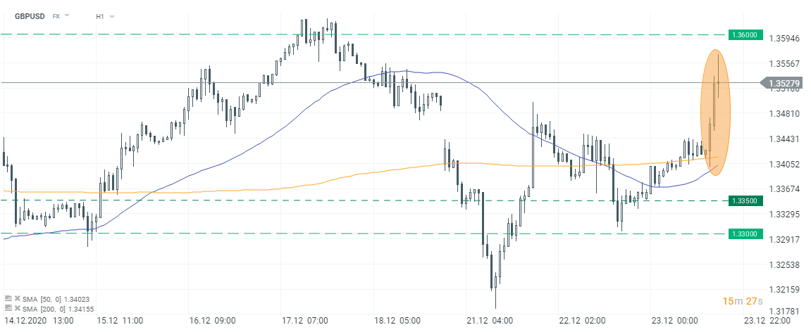 Para walutowa GBPUSD znajduje się już powyżej poziomu 1,3500. Na moment kurs zbliżył się bariery 1,3570. Rynki w pełni skupiają się obecnie na najnowszych doniesieniach, a potencjalne potwierdzenie porozumienia może doprowadzić do dalszych wzrostów na parze walutowej. Źródło: xStation5