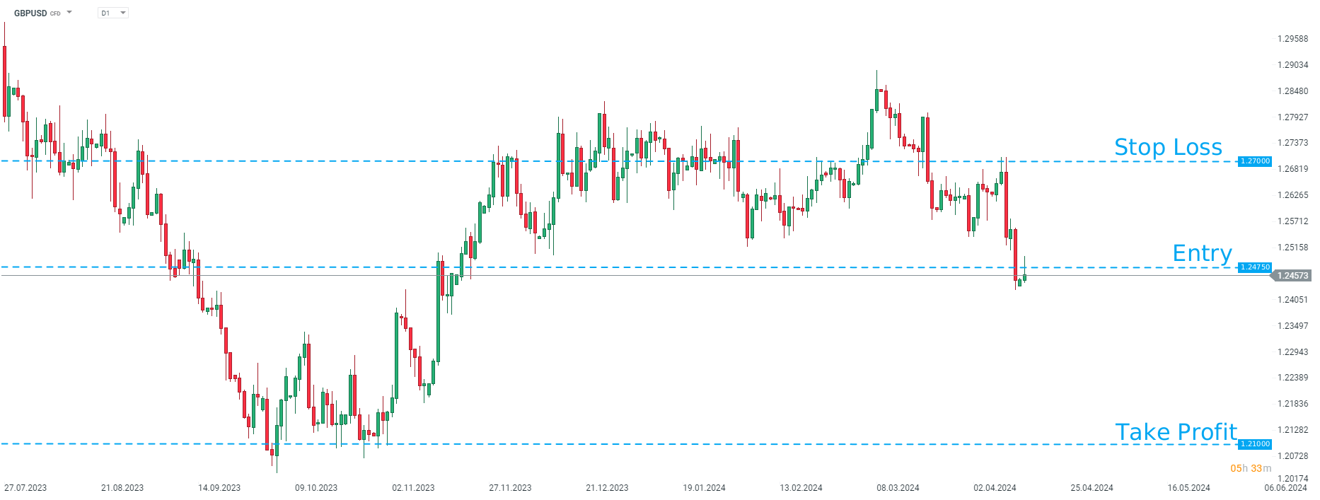 Barclays rekomenduje zajęcie krótkiej pozycji na GBPUSD po cenie rynkowej z celem na 1,2100 i zleceniem Stop Loss na poziomie 1,2700. Źródło: xStation5