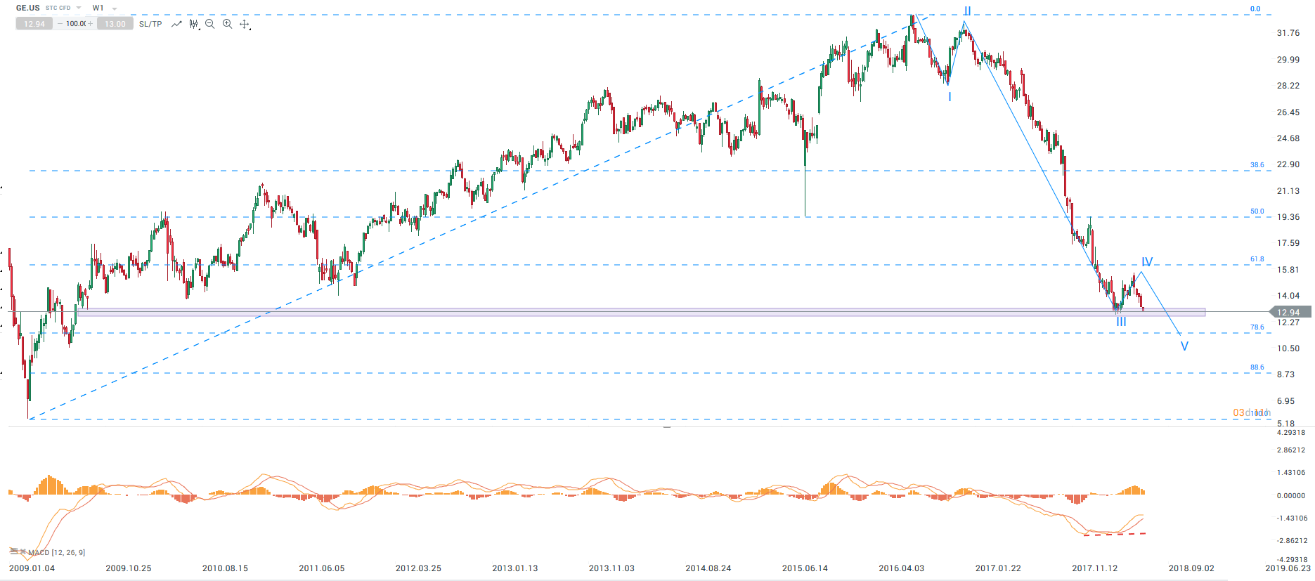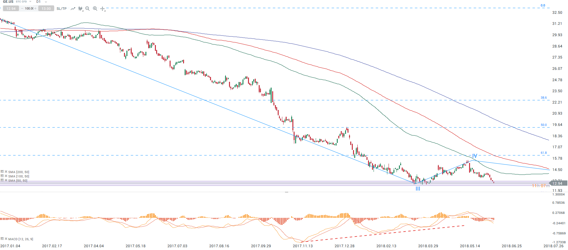 Co ciekawe od dołka kryzysu finansowego w 2009 roku US30 wzrósł o prawie 300%, podczas gdy GE niespełna 120%. Ewentualne wybicie tegorocznych dołków będzie potwierdzeniem trwającego od ponad 2 lat ruchu spadkowego. Dodatkowo zaneguje to byczą dywergencję na wskaźniku MACD, która tworzyła się od końcówki 2017 roku (wyższe dołki MACD przy coraz niższy dołkach GE).