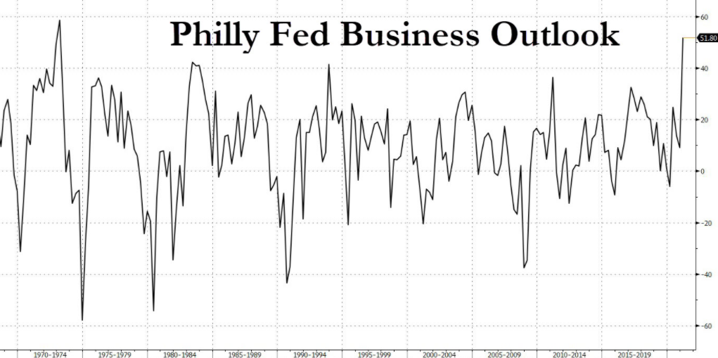 Indeks perspektyw biznesowych (aktywności gospodarcze) Fed z Filadelfii wypadł w marcu na poziomie 51,8 punktów wobec oczekiwanych 23.3 punktów! Ogromna zmiana, choć warto pamiętać, że indeksy regionalne są zwykle dosyć zmiennie. Niemniej jest to najlepszy odczyt od 1973 roku, a poprzednio odczyt wyniósł 23,1 punktów. Duże zmiany w nowych zamówienieach, niewielkei zmiany po stronie zatrudnienia (ale na plus) oraz lepsza ocena perspektyw. Niemniej duży wpływ na dzisiejszy odczyt ma jednak perspektywa cenowa. Tutaj odczyt wynosi 75,9 punktów przy 54,4 poprzedni. Jest to najwyższy odczyt od 1980 roku.