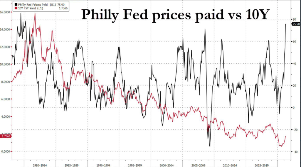 Indeks cen płaconych. W tym wypadku mamy odczyt najwyższy od 1980 roku, kiedy rentowności 10 letnich obligacji wynosiły 15%! Oczywiście żyjemy w innych czasach i warto popatrzeć na inne wystrzały, takie jak przed oraz po ostatnim kryzysie. Widać, że rentowności znajdowały się wtedy w okolicach 4%, ale poprawa rentowności była wtedy jedynie tymczasowa. Widać, że trend w rentownościach pozostaje niezmienny. Z drugiej strony, jeśli perspektywy cenowe utrzymają się wysoko przez dłuższy czas, możliwe, że rentowności ustabilizują się na wywyższonym poziomie. Czy byłoby to w takim przypadku 2%, czy może wyżej? Źródło: Bloomberg, ZeroHedge