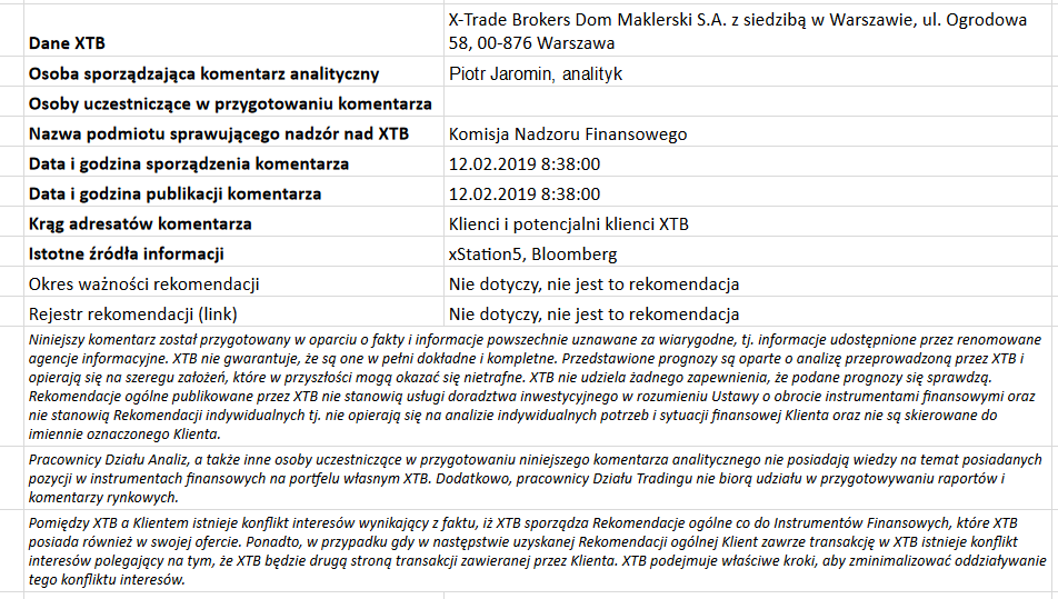 Ta publikacja handlowa jest informacyjna i edukacyjna. Nie jest rekomendacją inwestycyjną ani informacją rekomendującą lub sugerującą strategię inwestycyjną. W materiale nie sugerujemy żadnej strategii inwestycyjnej ani nie świadczymy usługi doradztwa inwestycyjnego. Materiał nie uwzględnia indywidualnej sytuacji finansowej, potrzeb i celów inwestycyjnych klienta. Nie jest też ofertą sprzedaży ani subskrypcji. Nie jest zaproszeniem do nabycia, reklamą ani promocją jakichkolwiek instrumentów finansowych. Publikację handlową przygotowaliśmy starannie i obiektywnie. Przedstawiamy stan faktyczny znany autorom w chwili tworzenia dokumentu. Nie umieszczamy w nim żadnych elementów oceniających. Informacje i badania oparte na historycznych danych lub wynikach oraz prognozy nie stanowią pewnego wskaźnika na przyszłość. Nie odpowiadamy za Twoje działania lub zaniechania, zwłaszcza za to, że zdecydujesz się nabyć lub zbyć instrumenty finansowe na podstawie informacji z tej publikacji handlowej. Nie odpowiadamy też za szkody, które mogą wynikać z bezpośredniego czy też pośredniego wykorzystania tych informacji. Inwestowanie jest ryzykowne. Inwestuj odpowiedzialnie.