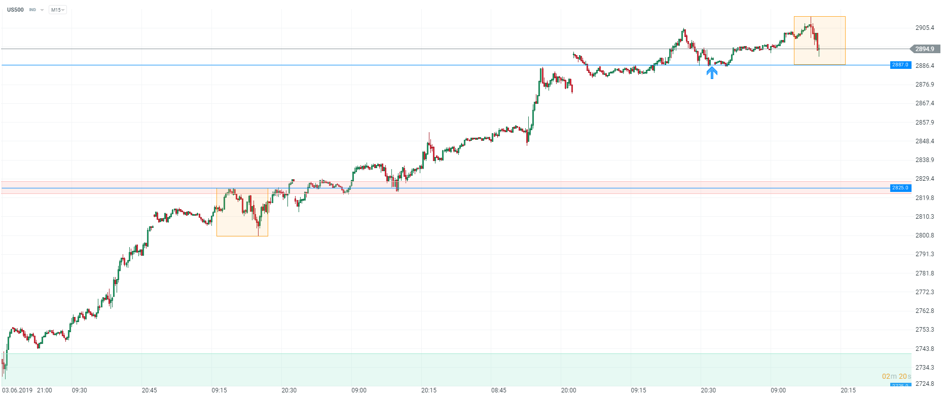Patrząc na S&P500 (US500) widać, że właściwie od 4 czerwca znajdujemy się w silnym trendzie wzrostowym. Dopiero załamanie poziomu 2887 pkt, może doprowadzić do większej przeceny.