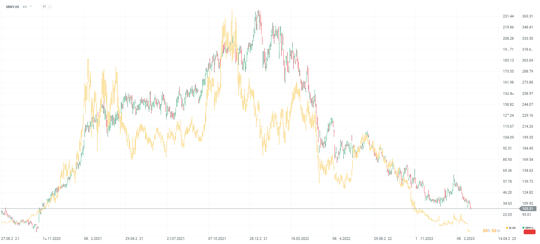 Akcje Silvergate Capital (SI.US) oraz wspomnianego Signature Bank (SBNY.US) - zaznaczone kolorem żółtym. Źródło: xStation5