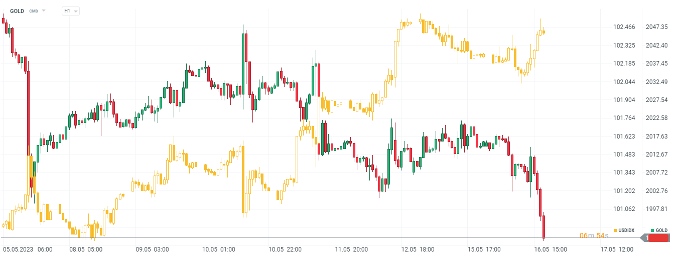 Wykres GOLD w relacji do kontraktów na indeks dolara USDIDX. Widać ujemną korelację między siłą greenbacka a złotem. Odczyty makro z gospodarki USA oraz jastrzębie komentarze członków Fed wsparły dolara przyczyniając się do gwałtownego spadku cen złota. Źródło: xStation5