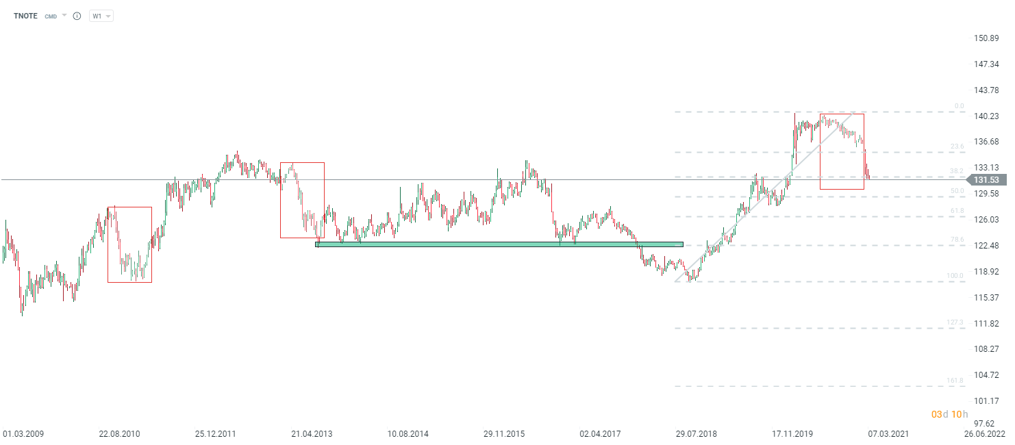 Tymczasem TNOTE kontynuują spadki w oczekiwaniu na rozczarowanie dzisiejszą decyzją Fed. Warto zauważyć, że ostatnie silne fale spadkowe na TNOTE zawierały się w większości w zakresie ok. 10-11 punktów. Czy wobec tego spadek cen zakończy się w okolicach zniesienia 50.0? Wszystko może zależeć dziś od Fed. Źródło: xStation5
