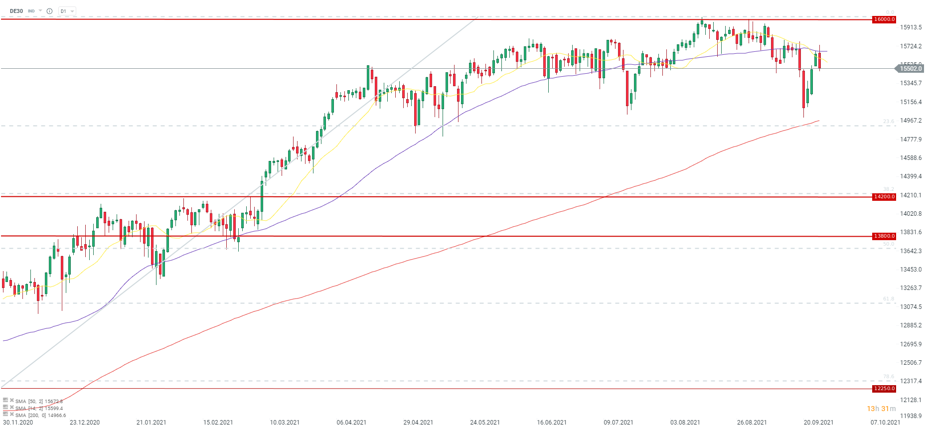 DAX wyraźnie traci podczas dzisiejszej sesji, od początku handlu kasowego. DAX zareagował na opór w postaci średniej 50 okresowej i obecnie testuje dolne ograniczenie luki, która miała miejsce między środowym zamknięciem i czwartkowym otwarciem. Źródło: xStation5