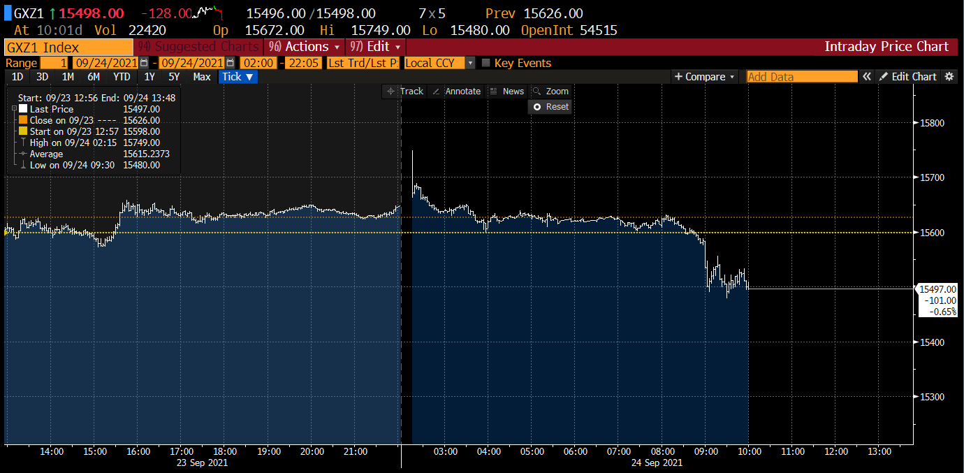 Dzisiaj poznaliśmy dane z niemieckiego instytutu Ifo, który dotyczy nastrojów biznesowych. Indeks spada, ale nieznacznie poniżej oczekiwań oraz poprzedniego odczytu. Za wrzesień mamy odczyt na poziomie 98,8 punktów przy oczekiwaniu 98,9 punktów oraz przy poprzednim poziomie 99,6 punktów. Jak wskazuje sam instytut, pogorszenie nastrojów jest związane z niedostatkiem potrzebnych towarów. Te nastroje mają utrzymać się do końca tego roku.