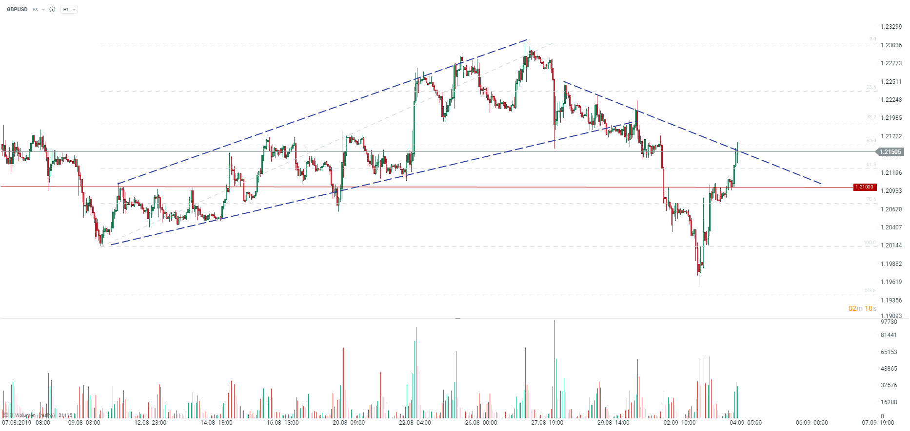 GBPUSD zyskuje głównie ze względu na to, że znacząco zmniejszyło się ryzyko wyjścia Wielkiej Brytanii z UE bez porozumienia. Funt testuje jednak ważny opór w postaci zniesienia 50.0 poprzedniej dużej fali wzrostowej oraz linię trendu spadkowego. Źródło: xStation5