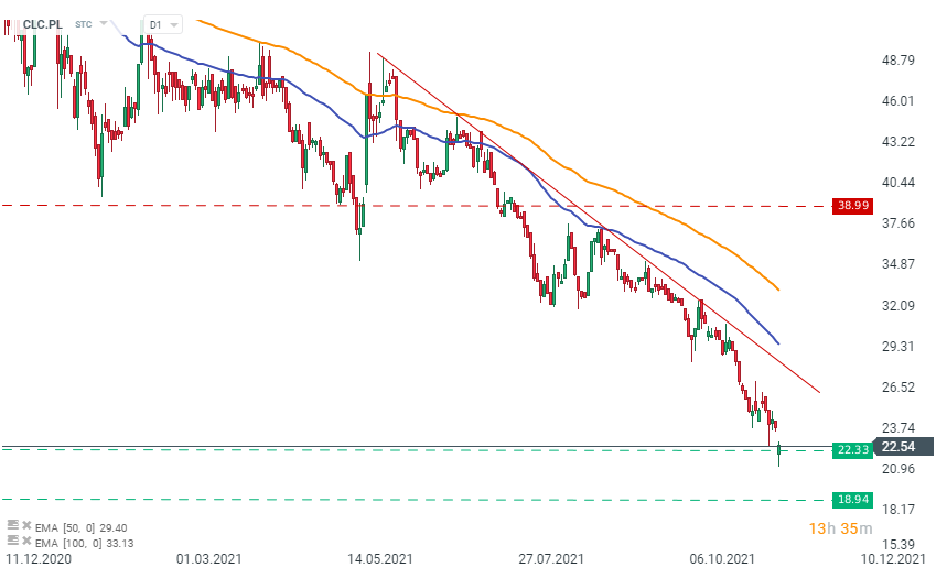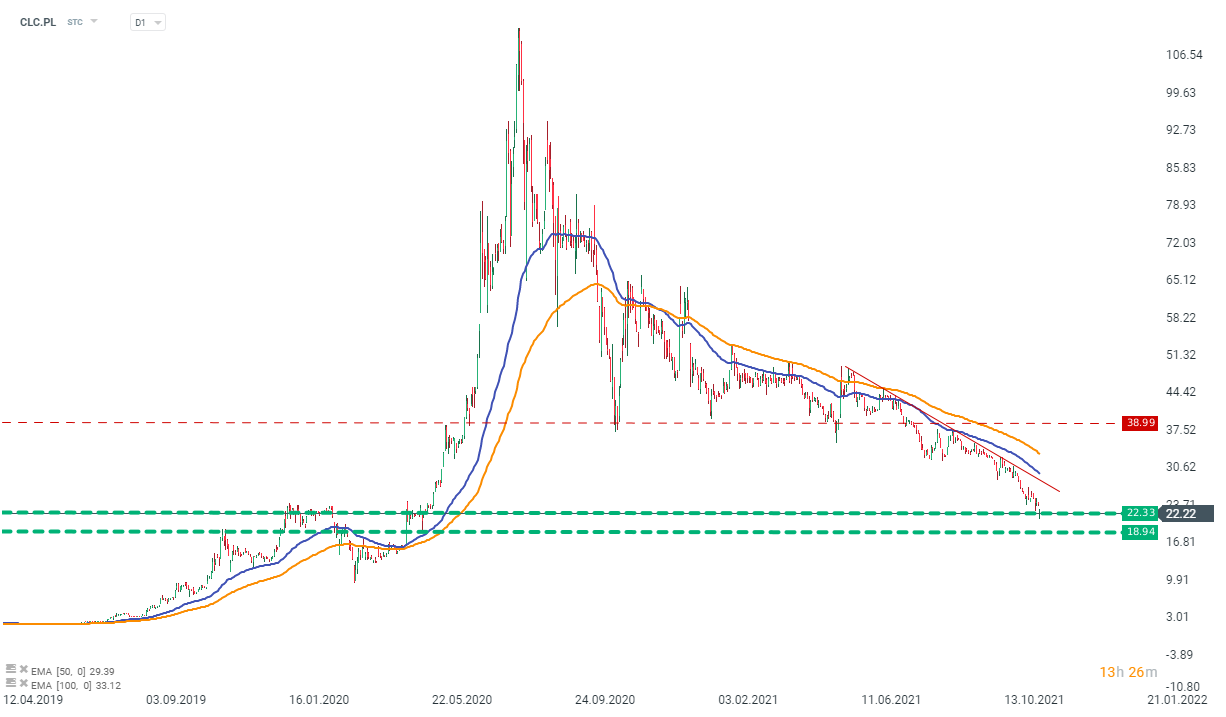 Patrząc na spółkę z perspektywy analizy technicznej, walory przedsiębiorstwa kontynuują dynamiczny ruch w dół po historycznej górce w okolicach 111,5 zł za akcję w sierpniu 2020 roku. Obecnie cena oscyluje w obszarze ważnych wsparć zaznaczonych na wykresie przerywanymi, zielonymi liniami. Poziomy te wyznaczały przeszłe obszary reakcji cenowych, które zapoczątkowały byczy rajd w 2020 roku. Wybicie tych poziomów dołem, mogłoby doprowadzić do pogłębienia spadków aż do nawet 11 zł za akcję. Gdyby jednak “bykom” udało się wybronić powyższe wsparcia, inwestorzy powinni zwrócić uwagę czy cenie uda się przekroczyć czerwoną linię trendu spadkowego. Źródło: xStation 5