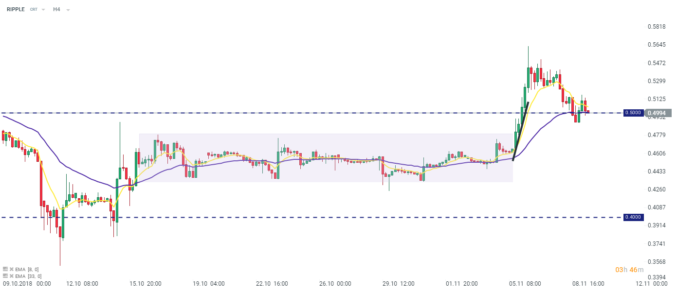 RIPPLE, w przeciwieństwie do wspomnianych wyżej kryptowalut, dał radę wypracować delikatny zysk dzisiejszego dnia. Źródło: xStation5.