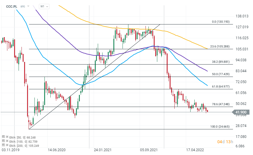 Wykres miesięczny notowań akcji spółki CCC (CCC.PL). Interwał W1. Źródło: xStation 5