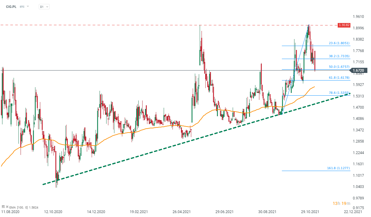 Wykres CI Games (CIG.PL,interwał D1). Walory spółki poruszają się obecnie zgodnie z niepełną formacją trójkąta zwyżkującego, którą wybicie najczęściej odbywa się przez górne ograniczenie i kontynuację ruchu zwyżkującego. Aktualnymi, ważnymi wsparciami są następująco: zniesienie 50% Fibo, zniesienie 61,8% Fibo + 100 okresowa średnia krocząca (pomarańczowa linia) oraz najważniejsze, dolne ograniczenie formacji trójkąta (zielona przerywana linia). Źródło: xStation 5