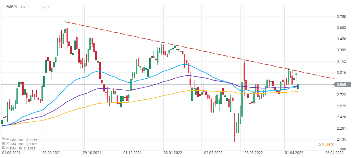 Wykres spółki Famur (FMF.PL), interwał D1. Walory akcji firmy w chwili obecnej utrzymują obszar wsparć wyznaczonych przez 50-, 100- oraz 200- dniową, wykładniczą, średnią kroczącą (odpowiednio niebieska, fioletowa oraz złota linia). Dla strony popytu kluczowym celem jest w chwili obecnej opór wyznaczony przez średnioterminową linię trendu spadkowego (czerwona, przerywana linia). Źródło: xStation 5