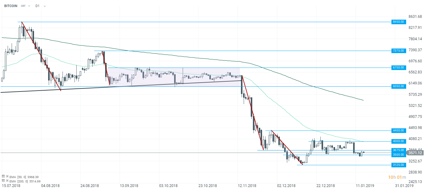 Bitcoin (BITCOIN na xStation5) doświadczył wczoraj wyraźnego wzrostu, jednak dzisiejszy handel okazał się nie być już tak udany. Około czternastej cena kryptowaluty znajdowała się trochę poniżej poziomu 3600 dolarów. Źródło: xStation5.