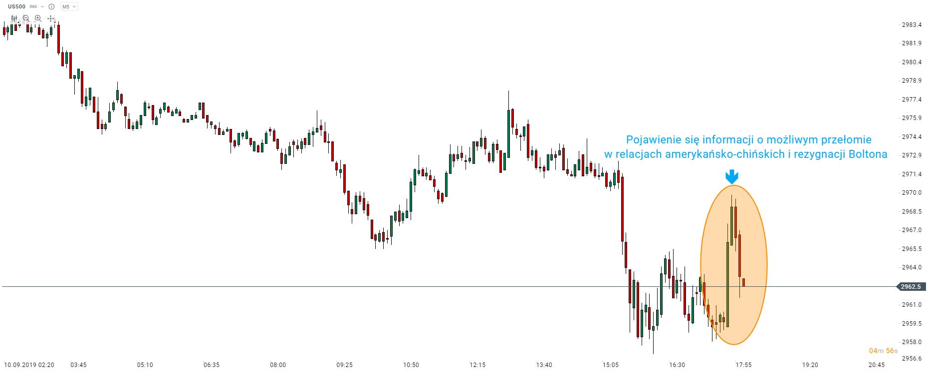Indeks S&P 500 podskoczył o około 10 punktów w nadziei na poprawę w relacjach amerykańsko-chińskich. Niemniej wzrost zaczął być wymazywany po informacji o rezygnacji Boltona. Źródło: xStation5