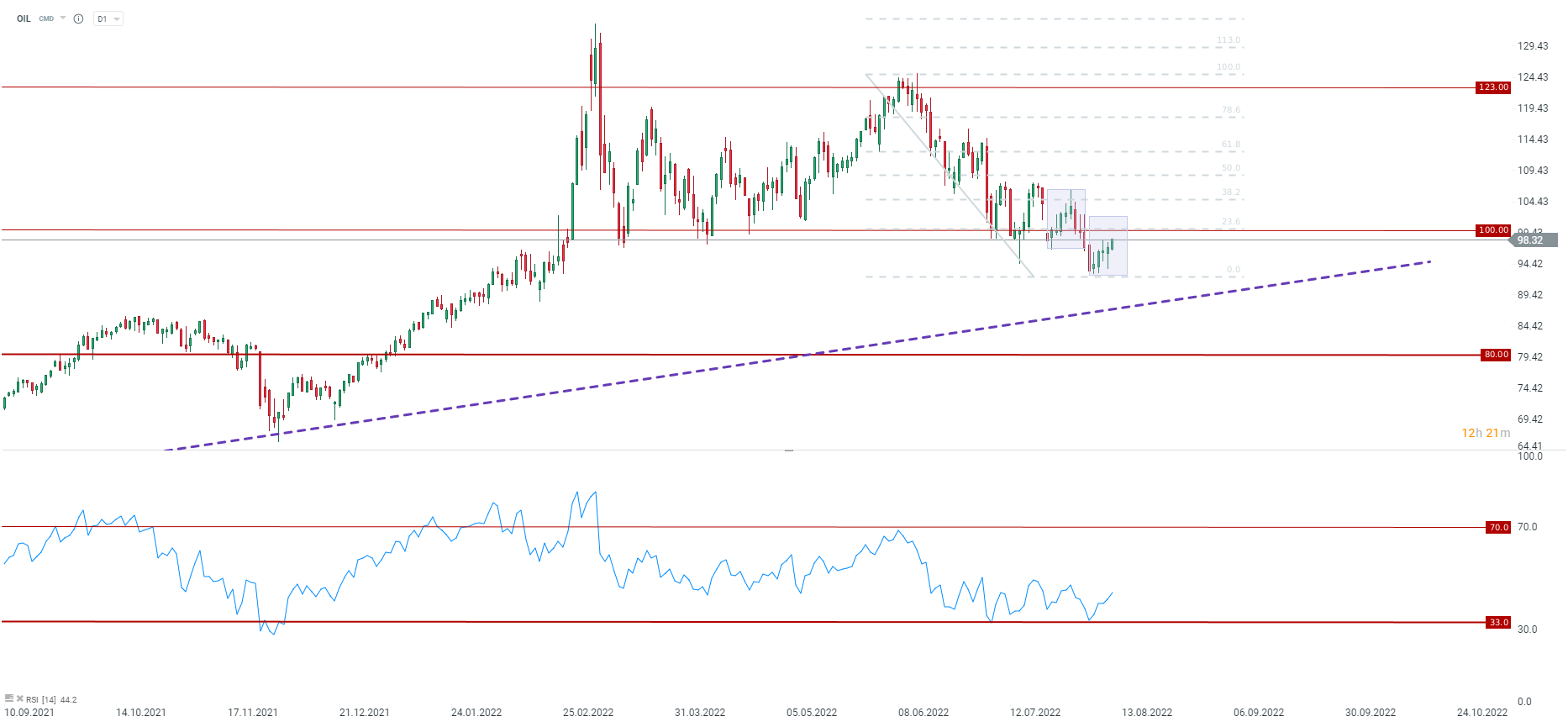 Ropa kontynuuje odbicie, ale wciąż na ten moment wydaaje się, że jest to odbicie w trendzie spadkowym. Słabszy dolar wspiera odbicie, ale obawy o recesję jeszcze się nie skończyły. Kluczowym wsparciem dla ropy jest linia trendu wzrostowego związanego z post covidowym odbiciem. Źródło: xStation5