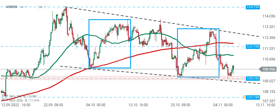 USDIDX odbił się od głównego wsparcia na 109,25, które jest oznaczone wcześniejszymi reakcjami cenowymi i dolnym limitem struktury 1:1. Dopóki cena znajduje się powyżej, kolejny impuls wzrostowy może zostać uruchomiony w kierunku lokalnego oporu na 111,70. Źródło: xStation5