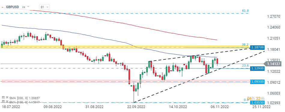 Para GBPUSD spadła w środę o ponad 1,0%, gdy inwestorzy zwrócili się w stronę bezpiecznych aktywów, takich jak dolar amerykański. Obecnie para zmierza w kierunku znacznego wsparcia na 1,1290, co zbiega się ze zniesieniem 23,6% fali spadkowej rozpoczętej w czerwcu 2021 r. i górną granicą formacji trójkąta. Źródło: xStation5