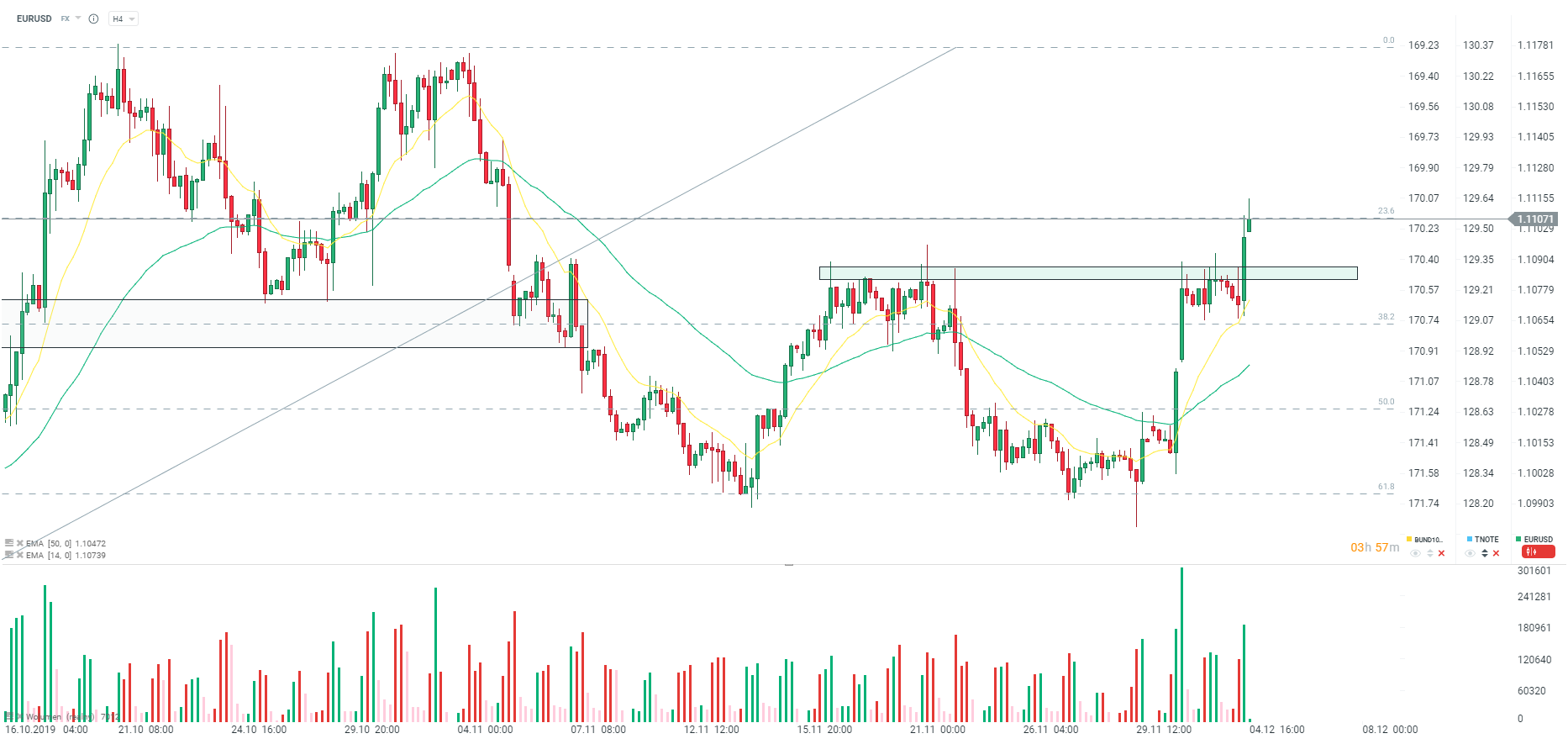 Dolar tracił w pierwszej reakcji, ale obecnie straty są ograniczane. EURUSD próbuje cofać się poniżej poziomu 1,1100. Źródło: xStation5