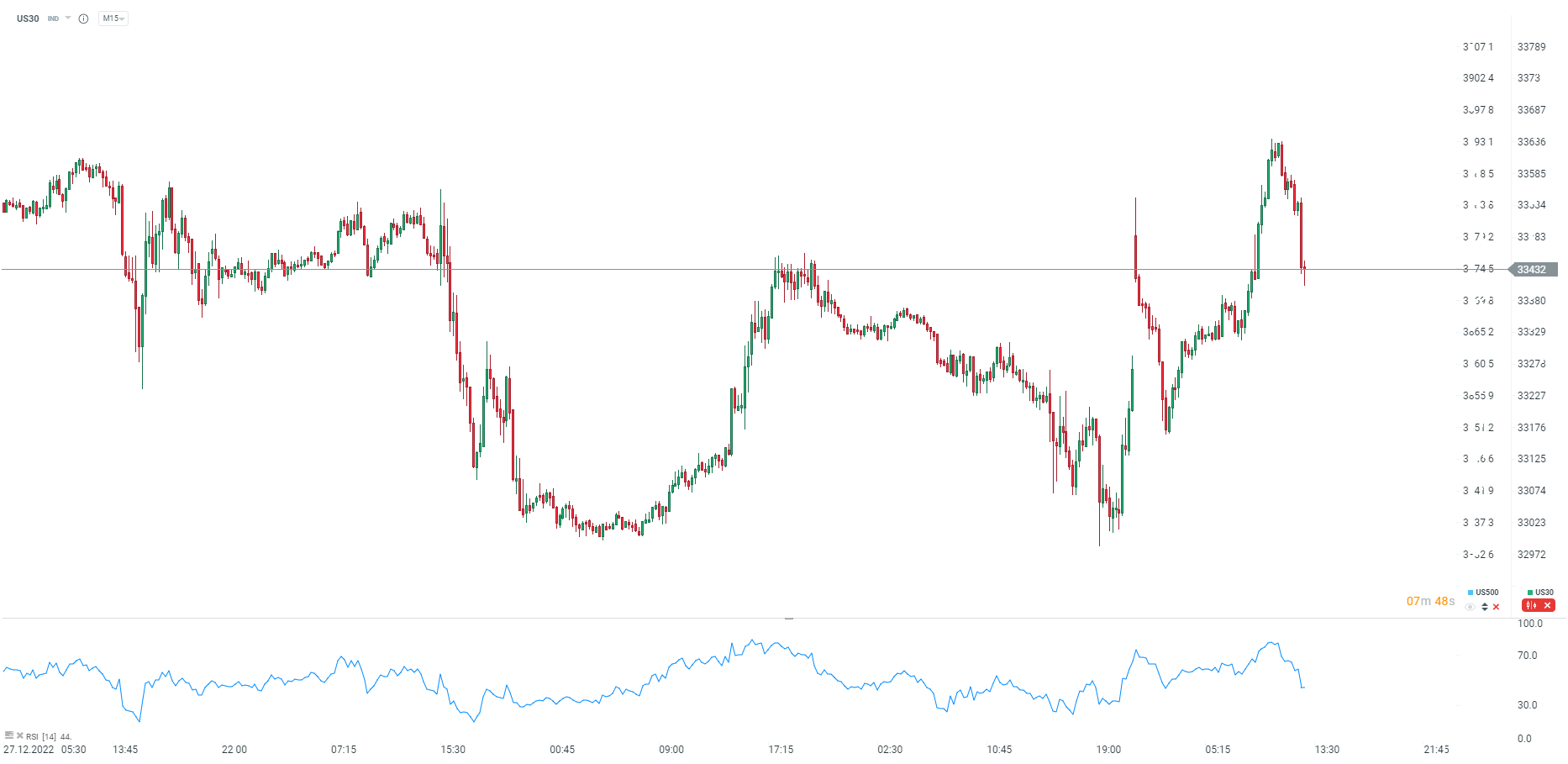 US30 od szczytu spadł już o ok. 0,6%, choć za cały dzień utrzymuje się wzrost rzędu 0,4%. Teoretycznie można zauważyć, że obecnie testowana jest potencjalna linia trendu wzrostowego wynikająca z ostatnich lokalnych dołków od 30 grudnia poprzedniego roku. Źródło: xStation5