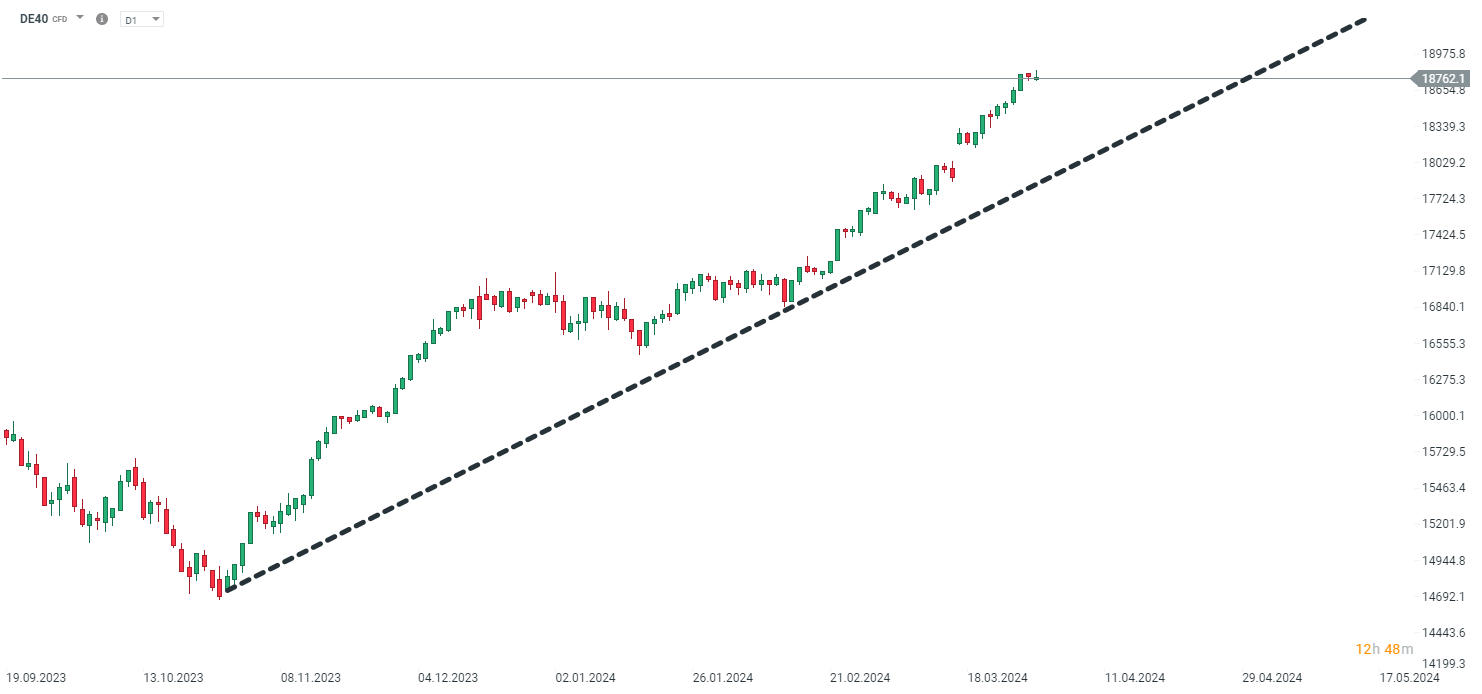DE40 wychodzi na nowe historyczne szczyty po publikacji indeksu PMI dla strefy euro. Niemniej już w ostatnich minutach obserwowaliśmy lekkie cofnięcie w okolicy dzisiejszego otwarcia. Dzisiaj z perspektywy europejskiej czeka nas również publikacja inflacji z Niemiec o godzinie 14:00. Bazując na odczytach z poszczególnych landów można oczekiwać odczytu na poziomie 2,3% r/r, natomiast konsensus rynkowy wskazuje na 2,2% r/r.