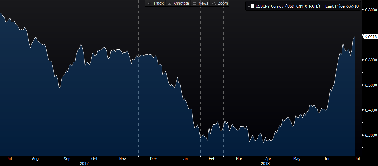 Kurs USDCNY osiągnął najwyższy poziom od sierpnia 2017 r. Źródło: Bloomberg