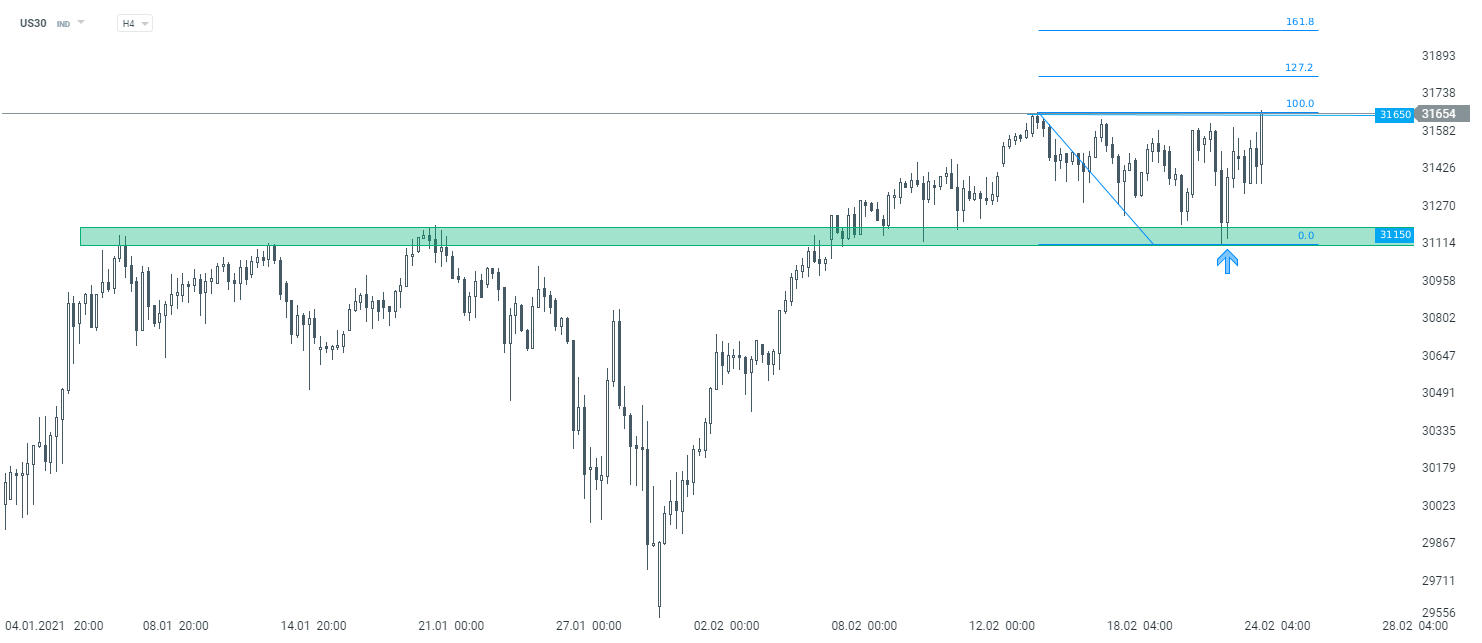 Patrząc na Dow Jones (US30) obserwujemy wyraźny ruch w górę, indeks znalazł się przed chwilą na najwyższych poziomach w historii. Jeżeli sentyment zostanie utrzymany, celem dla rynkowych byków powinny być mierzenia zewnętrzne Fibonacciego, wyznaczone na podstawie ostatniej korekty spadkowej.