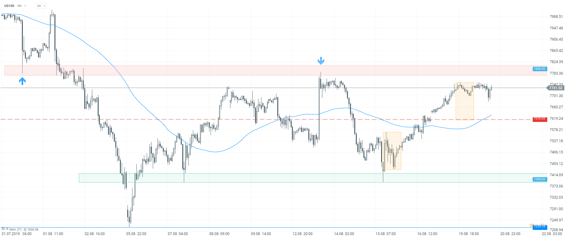 Zobaczmy jak kształtuje się sytuacja techniczna na US100. Jak widać, początek sesji rozpoczął się od ruchu w dół, który teraz został zniwelowany. Jednak aby mówić o większych wzrostach, kurs musiałby pokonać wczorajsze maksima. Trzeba też brać pod uwagę fakt, że kolejny opór znajduje się dość blisko, mowa tutaj o strefie 7800 pkt. Tak naprawdę dopiero jej pokonanie, mogłoby otworzyć drogę do większych wzrostów. Jeśli chodzi o dalszą część sesji, niewykluczone są oba scenariusze. Jeżeli sprzedający ponownie przejmują kontrolę, możliwe są spadki w rejony 7616 pkt, gdzie znajduje się lokalny układ 1:1. Z kolei jego pokonanie, może doprowadzić do większej wyprzedaży, wtedy też celem dla podaży byłby atak na dolne ograniczenie szerokiej konsolidacji - 7400 pkt.